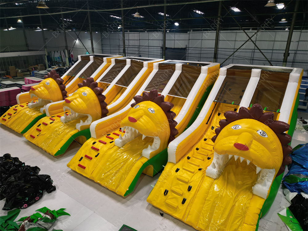 Estes são escorregadores infláveis projetados para serem usados com piscinas. Eles apresentam um design animado de cabeça de leão, com amarelo brilhante